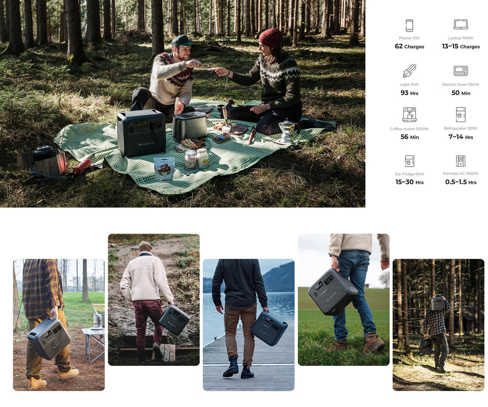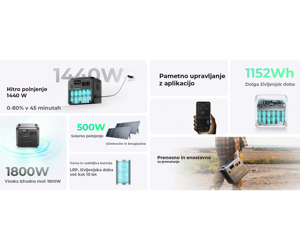 BLUETTI AC180 prenosna polnilna postaja je vaš zanesljiv partner za vse energetske potrebe. Z močjo 1800W in kapaciteto 1152Wh zagotavlja, da bodo vaše naprave vedno pripravljene na uporabo. Ne glede na to, ali gre za polnjenje telefonov, tablic ali napajanje manjših gospodinjskih aparatov, AC180 poskrbi za vse. Opremljena je s tehnologijo hitrega polnjenja, ki omogoča hitro napolnitev naprav, kar je idealno za dinamičen življenjski slog. Poleg tega, zahvaljujoč LiFePO4 bateriji, ponuja dolgotrajno in varno uporabo, kar pomeni več kot 3500 ciklov do 80% prvotne zmogljivosti.
