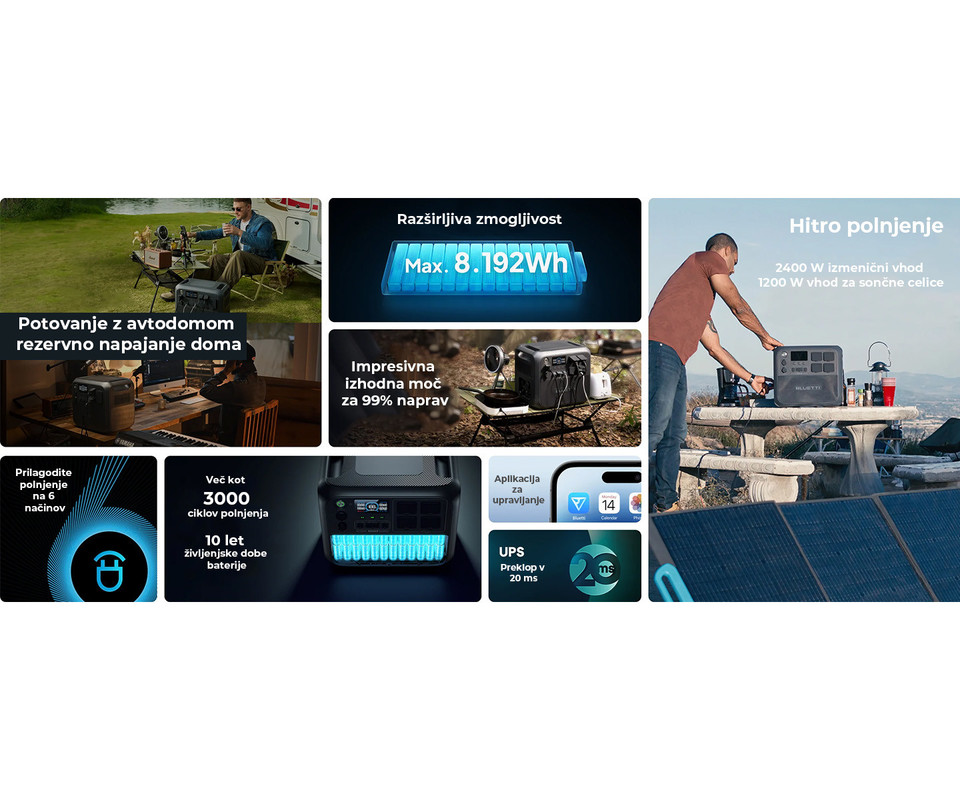 Če iščete zanesljivo in vsestransko rešitev za napajanje vaših naprav, je BLUETTI prenosna polnilna postaja prava izbira za vas. Ta inovativna naprava ponuja neverjetno kapaciteto 2048Wh, kar omogoča dolgotrajno napajanje različnih naprav, od telefonov do mini hladilnikov. S svojo robustno LiFePO4 baterijo zagotavlja varnost in dolgo življenjsko dobo, saj omogoča več kot 3000 ciklov polnjenja. Poleg tega je opremljena s številnimi izhodi, vključno z USB-C, USB-A in AC vtičnicami, kar omogoča hkratno polnjenje več naprav. Ne glede na to, ali ste doma ali na poti, je ta polnilna postaja vaš zanesljiv vir energije.