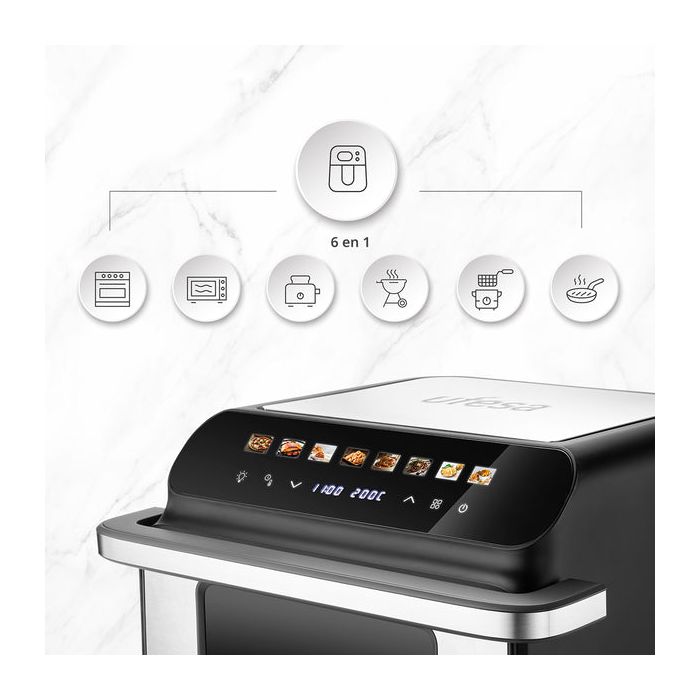 Cvrtnik na vroč zrak in pekač za pico UFESA je zasnovana za enostavno uporabo, zahvaljujoč barvnemu zaslonu na dotik, ki omogoča preprosto nastavitev časa in temperature. S kapaciteto 10 litrov in močjo 2000 W je ta cvrtnik popoln za pripravo večjih obrokov. Poleg tega je opremljen z 8 prednastavljenimi programi, ki olajšajo kuhanje različnih jedi. Priloženi dodatki, kot so neoprijemljiva košara in pladenj, žar dodatki ter deli primerni za pomivanje v pomivalnem stroju, še dodatno poenostavijo čiščenje.