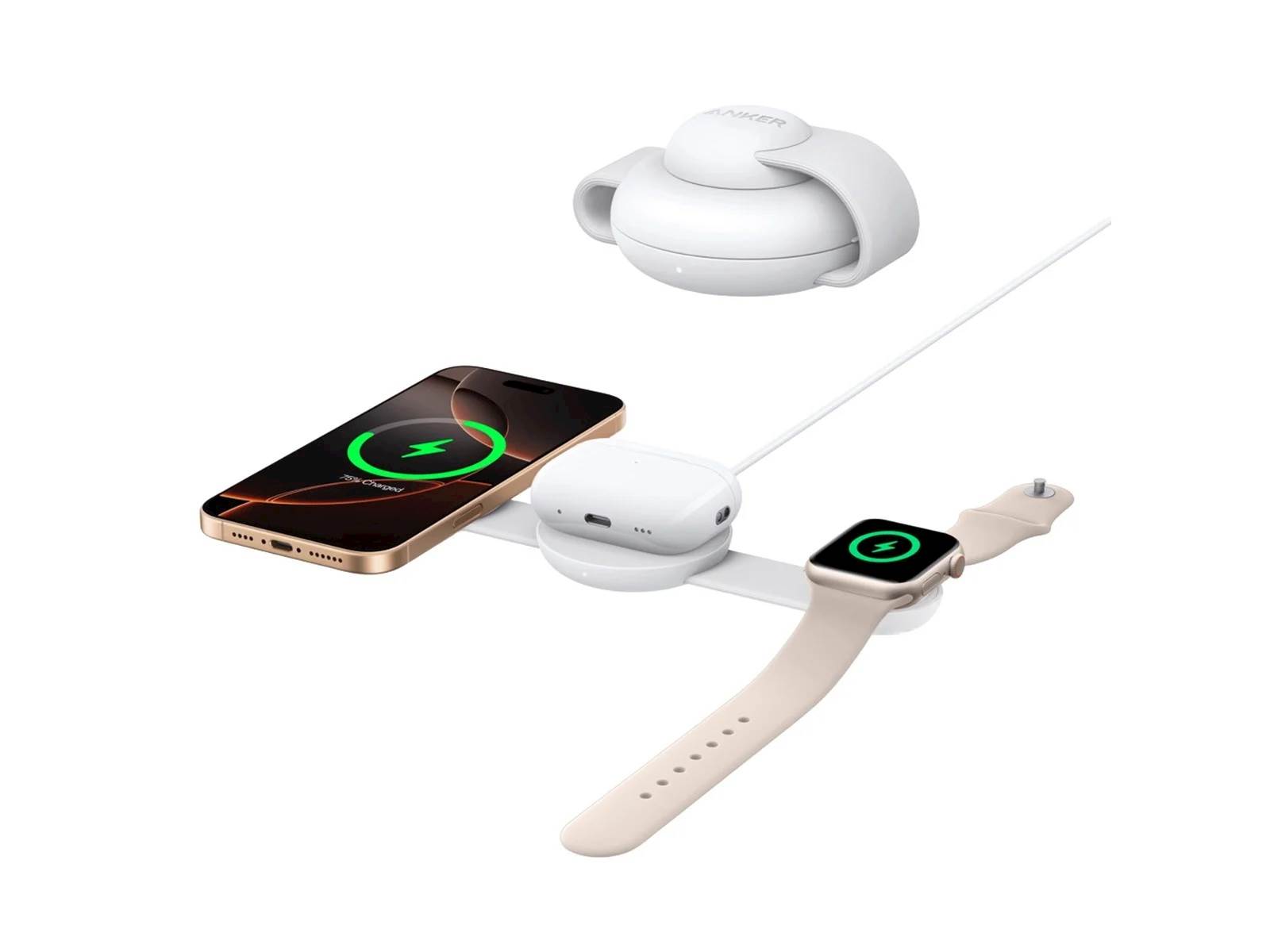 Brezžična polnilna postaja Anker 3v1 je zasnovana tako, da prihrani prostor na vaši mizi, hkrati pa omogoča sočasno polnjenje treh ključnih Apple naprav. Njena kompaktna oblika omogoča, da jo enostavno zložite in vzamete s seboj kamorkoli greste. S svojo elegantno belo barvo se brez težav zlije z vsakim okoljem, medtem ko nastavljiv kot omogoča optimalen pogled na zaslon vašega iPhone-a v StandBy načinu. Ta polnilna postaja je popolna kombinacija hitrosti, elegance in praktičnosti, ki jo potrebujete v svojem vsakdanjem življenju.