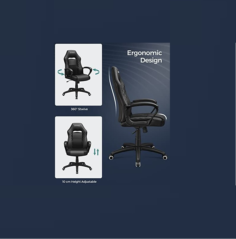 SONGMICS športni pisarniški stol OBG38BKV1 je zasnovan za tiste, ki cenijo ergonomijo in stabilnost. Njegova robustna zvezdasta osnova in gladko delujoča kolesca zagotavljajo stabilnost in enostavno premikanje po prostoru. Plinska jeklenka, preizkušena pri TÜV, zagotavlja varnost in dolgo življenjsko dobo. Stol je opremljen z udobnimi najlonskimi nasloni za roke, ki dodatno prispevajo k udobju med delom ali igranjem iger. S preprosto montažo, ki zahteva le 12 vijakov, je ta stol pripravljen za uporabo v le nekaj minutah.