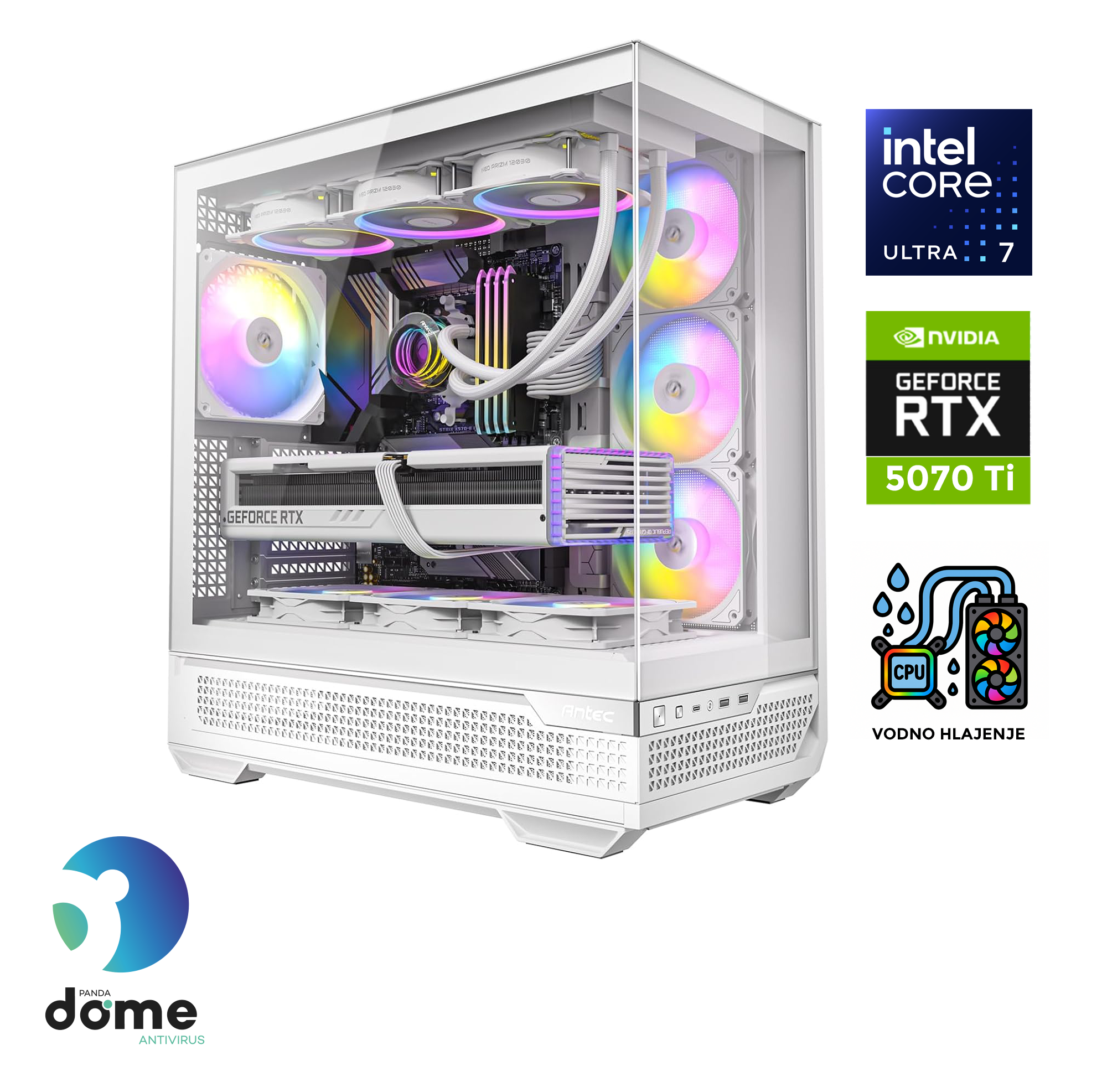 Ta vrhunski računalnik je zasnovan za igričarje, ki iščejo brezkompromisno zmogljivost in hitrost. Opremljen je z najnovejšim procesorjem Intel Core Ultra 7-265KF, ki omogoča gladko delovanje tudi pri najzahtevnejših igrah in aplikacijah. Z 64 GB DDR5 pomnilnika in grafično kartico Nvidia GeForce RTX 5070 Ti, bo vaša igričarska izkušnja postala bolj realistična in tekoča kot kdajkoli prej. Poleg tega 2 TB M.2 NVMe SSD disk zagotavlja izjemno hitro nalaganje iger in aplikacij, kar vam omogoča, da se takoj potopite v akcijo. Računalnik je opremljen z vodnim hlajenjem, ki zagotavlja optimalno temperaturo in tiho delovanje.