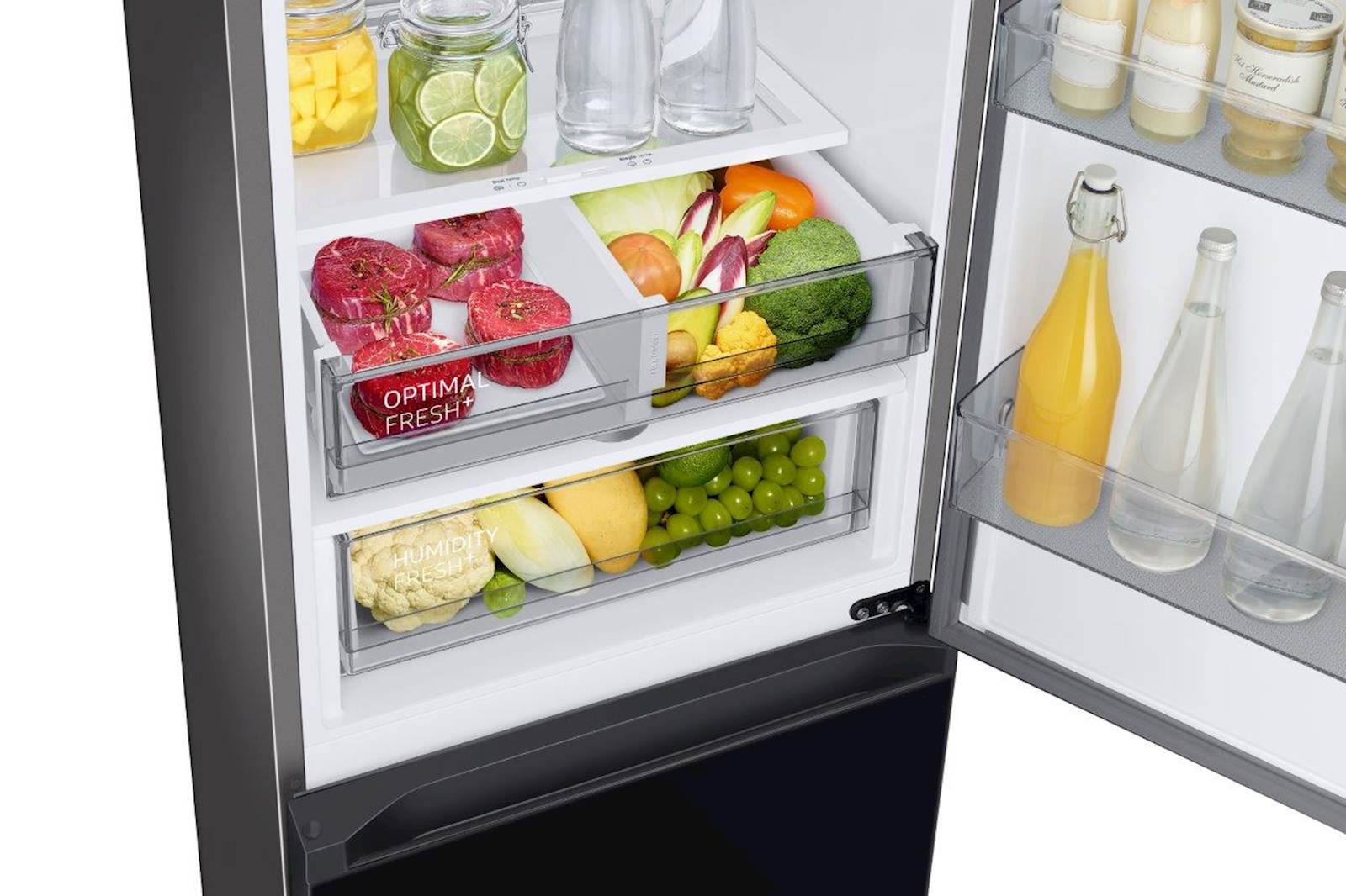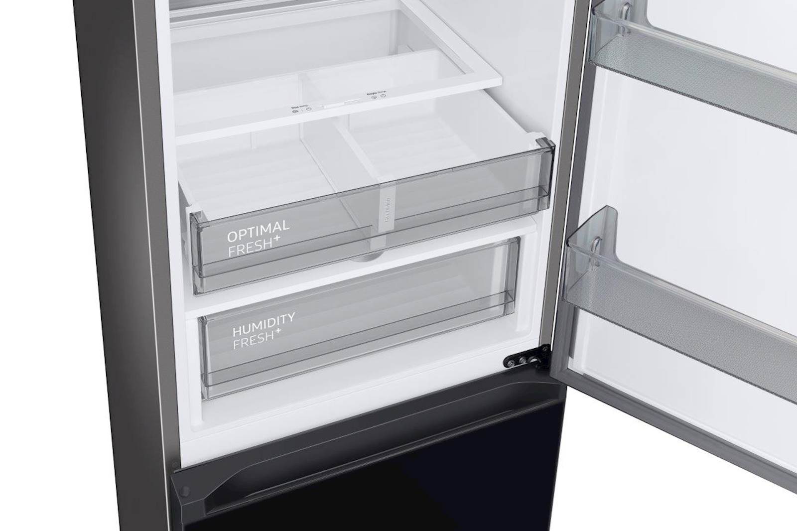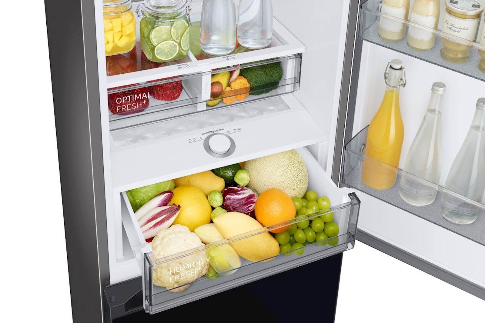 Samsung hladilnik Bespoke RB34C7B5E22/EF ponuja večfunkcijski Rack & Shelf™, ki omogoča shranjevanje debelejših steklenic vina ali hrane, kot je pizza. Dvostopenjsko zložljivo polico lahko izvlečete ali potisnete nazaj, kar omogoča lažje shranjevanje visokih steklenic in večjih predmetov. Kovinska hladilna plošča na zadnji steni pomaga ohranjati optimalno notranjo temperaturo, kar preprečuje izgubo hladnega zraka ob odpiranju vrat. Tehnologija No Frost izboljša kroženje zraka, ohranja stalno temperaturo in preprečuje nabiranje ledu.