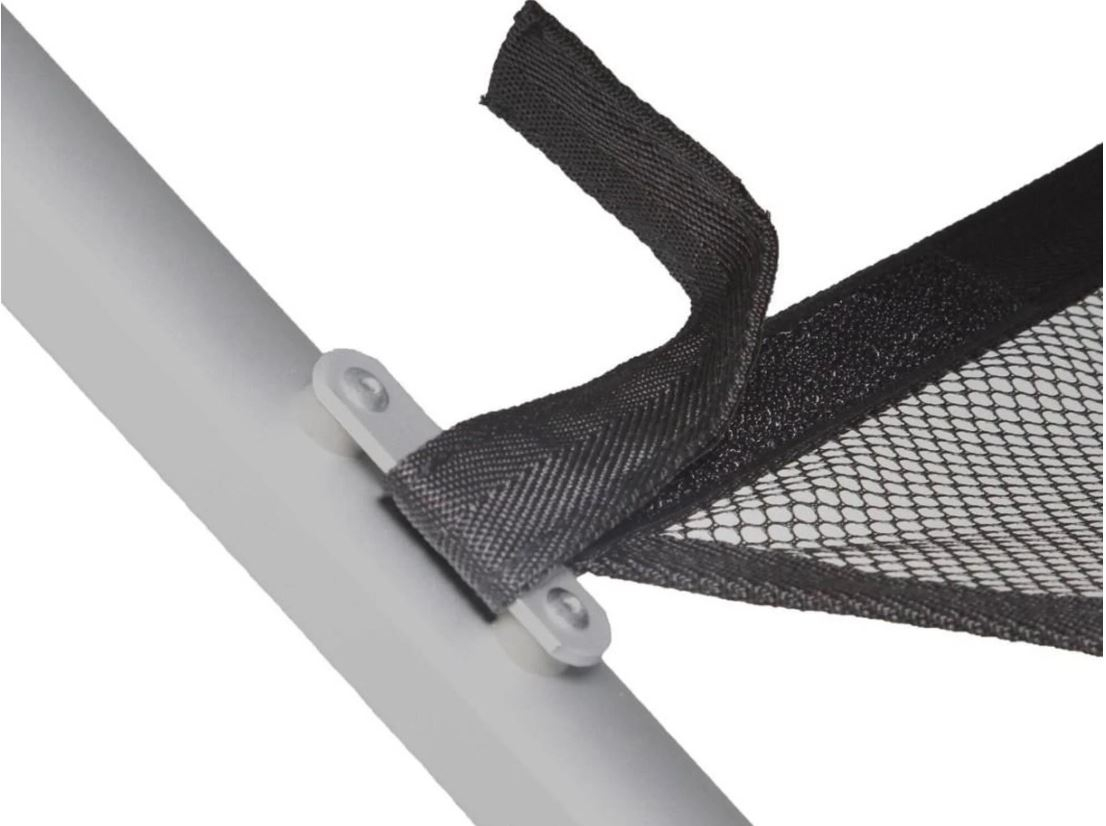Patentirana miza iz aluminija z enostavno zložljivim okvirjem. Odlikuje jo mrežasti prostor za odlaganje. Stabilen okvir iz kvadratnih aluminijastih cevi z nastavitvijo višine.