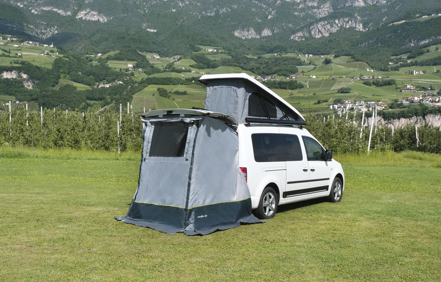 Posebej razvit zadnji šotor brez okvirja za pritrditev na zadnja vrata vozila VW Caddy. Idealen za ustvarjanje dodatnega prostora v zadnjem delu vozila in večjo svobodo gibanja v notranjosti. Hitra in enostavna montaža. 1 velika vhodna vrata zagotavljajo dobro prezračevanje in prijetno notranjo klimo. S pritrdilnim materialom in torbo za prenašanje.