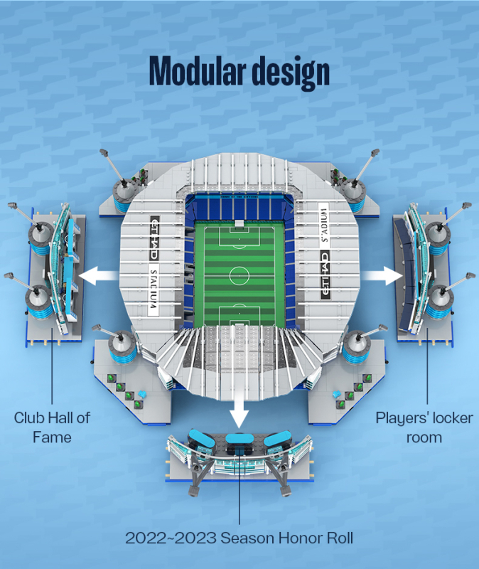 Doživite nogometno vzdušje kar v udobju svojega doma z natančno repliko Etihad stadiona. Ta model je uradno licenciran in ponuja realistično izkušnjo gradnje ter prikazovanja. Sestavljen iz 4473 kosov, omogoča poglobljeno sestavljanje, ki bo navdušilo vsakega ljubitelja nogometa in modelarstva. Modularna zasnova omogoča enostaven dostop do različnih delov stadiona, vključno z notranjo rekonstrukcijo igrišča, belimi črtami, goli ter sedeži za navijače. Osvetlitev z USB LED lučmi ustvarja pristno vzdušje večernih tekem, kar dodaja dodatno dimenzijo k vaši izkušnji.