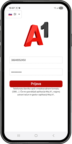 Vpiši uporabniško ime in geslo, ki ju uporabljaš za vpis v aplikacijo Moj A1. Če aplikacije ne uporabljaš, moraš najprej kreirati uporabniški račun za Moj A1.