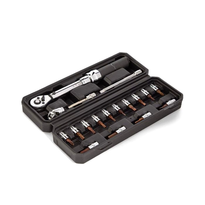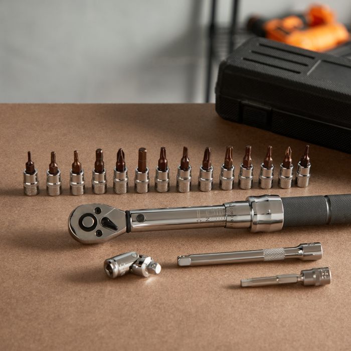 Set ročnega orodja VonHaus 19-delni E0014499 je idealen za vse, ki potrebujejo zanesljivo orodje za servisiranje koles. Ta komplet vključuje momentni ključ z razponom 2-20 njutonmetrov, kar omogoča natančno namestitev komponent. Orodje je opremljeno s certifikatom o kalibraciji, kar zagotavlja, da prejmete visokokakovostna in zanesljiva orodja. Poleg tega je set shranjen v odpornem ohišju, kar omogoča enostavno prenašanje in zaščito orodij pred poškodbami. Vzmetni nastavljivi obročki zaskočijo ključ, ko je dosežena zahtevana nastavitev navora, kar omogoča varno in enostavno uporabo.