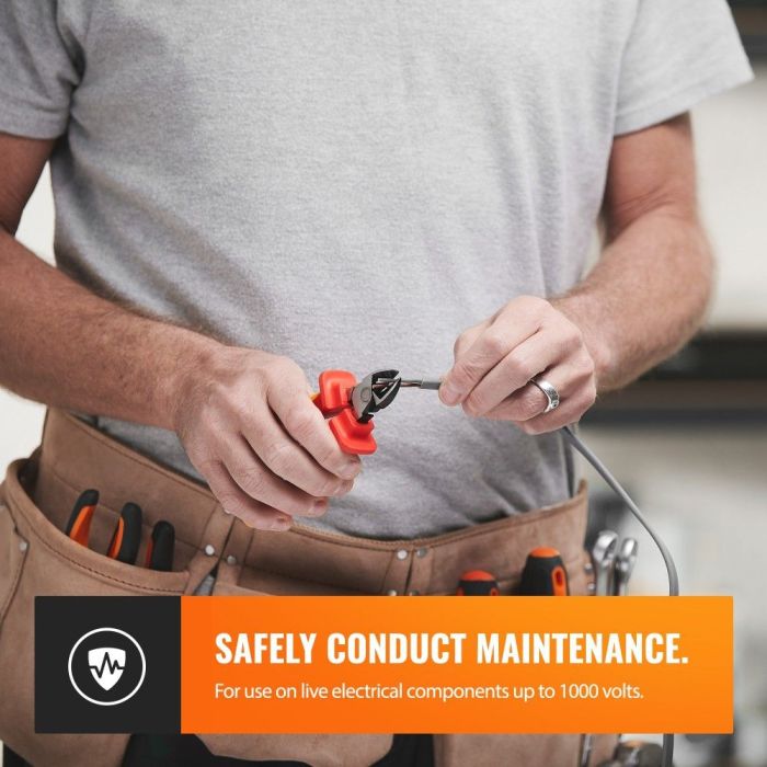 Ta ročni set orodja je idealna izbira za vse, ki potrebujejo zanesljivo in varno orodje za delo z električnimi napravami. Vključuje 15 kosov, med katerimi so klešče in izvijači, ki so zasnovani za delo z napetostjo do 1000 V. Izdelani so iz toplotno obdelanega krom-vanadijevega jekla, kar zagotavlja dolgotrajno uporabo in odpornost proti obrabi. Udobni ročaji z utori TPE omogočajo enostavno in varno rokovanje, medtem ko magnetne konice izvijačev olajšajo privijanje vijakov. Poleg tega set vključuje merilnik napetosti in izolirni trak, kar povečuje njegovo funkcionalnost.