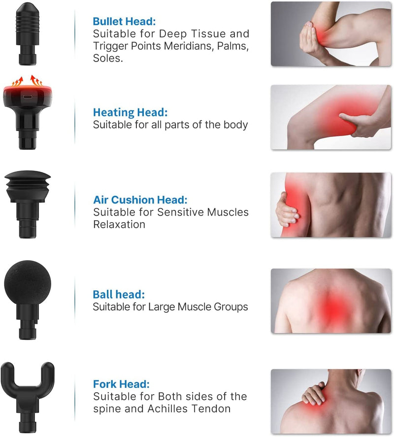 Ta masažna pištola ima 1 grelno glavo in 4 standardne masažne glave, ki se prilagajajo različnim delom telesa.