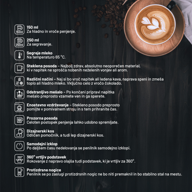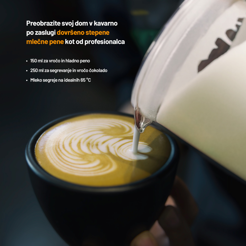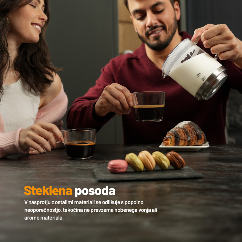 Uživajte v popolni mlečni peni, kot bi jo pripravil profesionalni barista, kar v udobju vašega doma. Ta izjemen penilec mleka omogoča pripravo tako tople kot hladne pene, s čimer lahko ustvarite različne napitke po vašem okusu. Steklena posoda omogoča spremljanje celotnega postopka priprave, kar zagotavlja natančnost in kakovost vsakega napitka. Poleg tega je posoda enostavna za čiščenje, saj jo lahko pomijete v pomivalnem stroju. S svojo tiho funkcionalnostjo ne bo motil vašega miru ali okolice, kar ga naredi idealnega za uporabo v vsakem trenutku dneva.