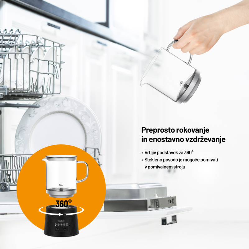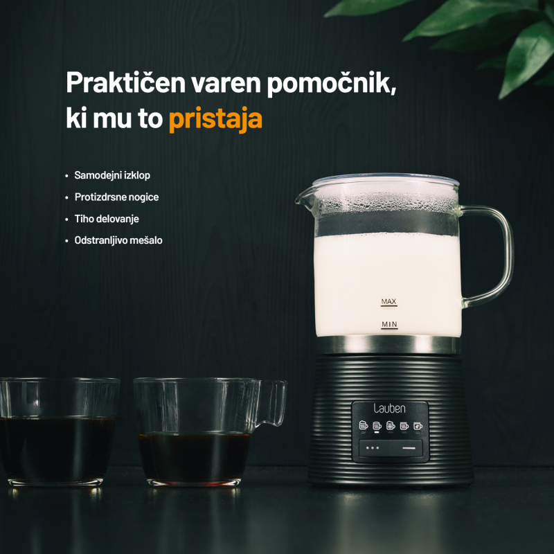 Penilec mleka Lauben LBMFMGMF600BA je zasnovan z mislijo na uporabnika. Njegova steklena posoda ne prevzema vonjav ali arom materiala, kar zagotavlja čisti okus vašega napitka. Poleg tega je posoda enostavna za vzdrževanje, saj jo lahko preprosto pomijete v pomivalnem stroju. S funkcijo samodejnega izklopa in protizdrsnimi nogicami je uporaba varna in brezskrbna. Naprava omogoča pripravo do 250 ml segretega mleka ali 150 ml pene, kar je dovolj za več skodelic vaših najljubših napitkov.