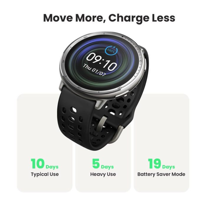 Eleganca in funkcionalnost se združujeta v pametni uri, ki je zasnovana za sodobnega uporabnika. Ohišje iz nerjavečega jekla in svetel 1,32-palčni AMOLED zaslon omogočata odlično berljivost tudi na neposredni sončni svetlobi. S tehnologijo BioTracker natančno spremljate srčni utrip in spanje, kar vam omogoča boljše razumevanje vašega zdravja. Ura je opremljena z več kot 160 športnimi načini, kar vključuje tudi vodoodpornost do 50 metrov, zaradi česar je idealna za plavanje in smučanje. Z dolgo življenjsko dobo baterije, ki zdrži do 10 dni, se izognete vsakodnevnemu polnjenju.