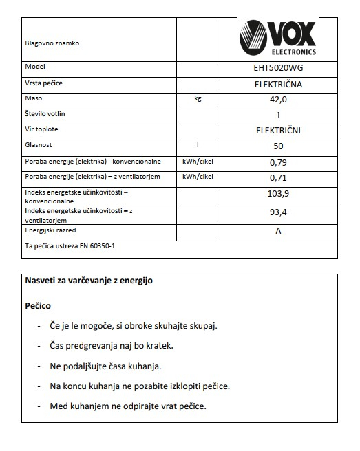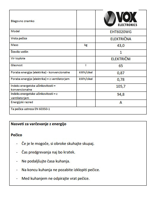 Električni štedilnik Vox EHT 6020 WG - energijska učinkovitost