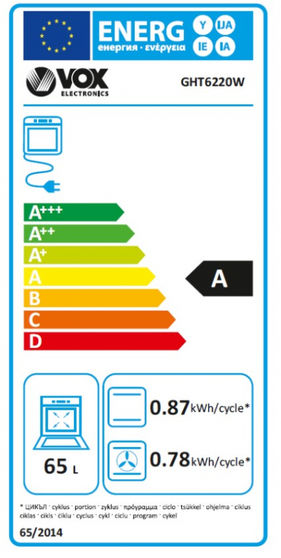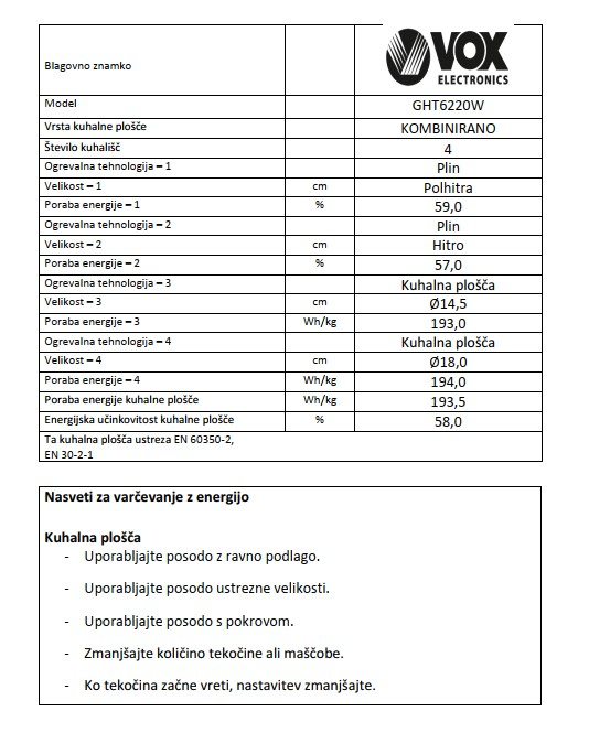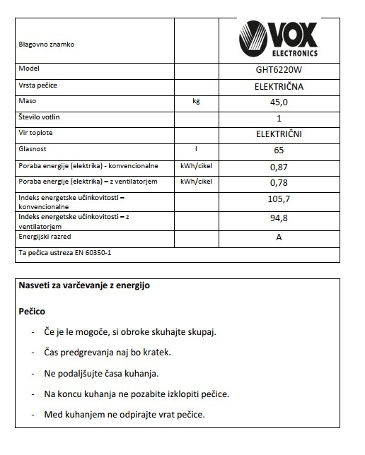 Električni štedilnik Vox GHT 6220 W z energijsko učinkovitostjo