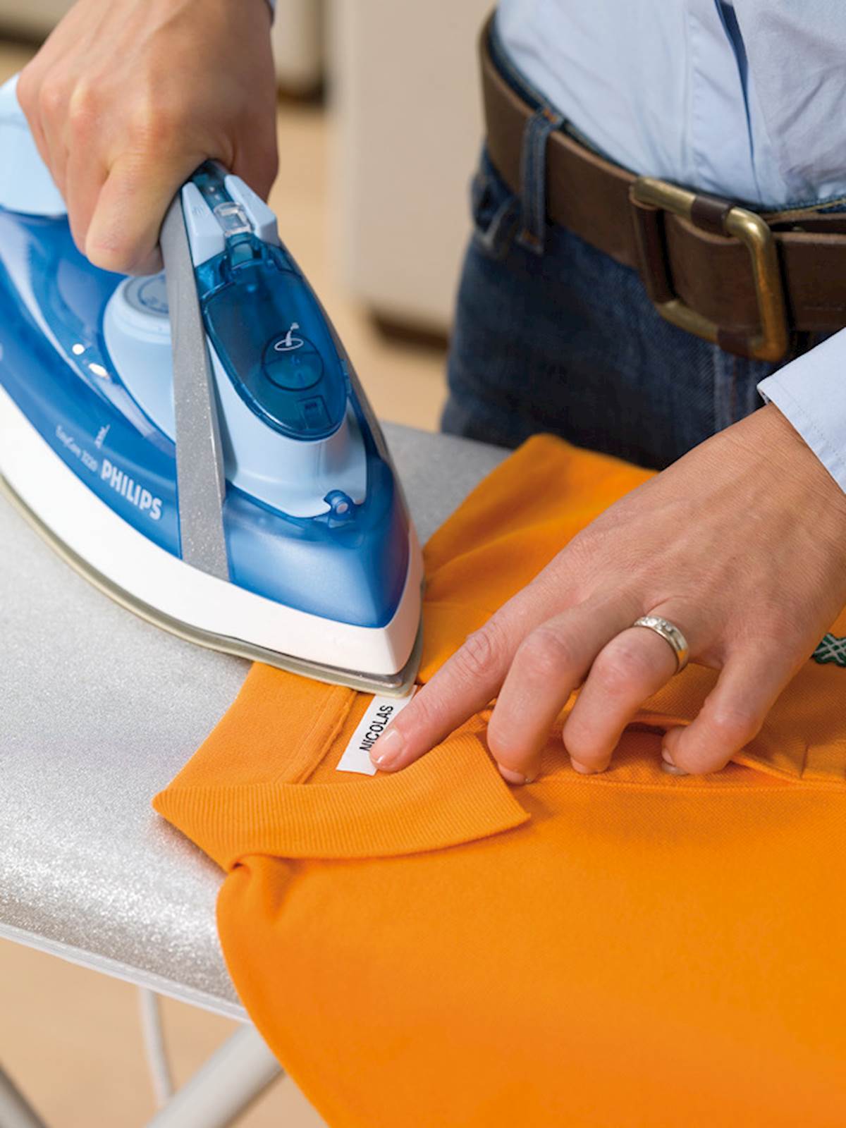 Iron-on trak DYMO LT 12 mm črna na beli model 18769 omogoča enostavno označevanje