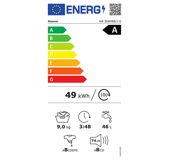 Pralni stroj Hoover HW 29AMBS/1-S je zasnovan za izjemno energijsko učinkovitost, saj se uvršča v energijski razred A. S porabo energije le 49 kWh na 100 ciklov pranja, je ta stroj odlična izbira za okoljsko ozaveščene uporabnike. Funkcija Kg Mode PLUS samodejno prilagodi količino vode glede na vrsto in količino perila, kar dodatno zmanjšuje porabo energije in skrajša čas pranja. S tem pralnim strojem boste prihranili tako energijo kot denar, hkrati pa poskrbeli za popolno nego vaših oblačil.