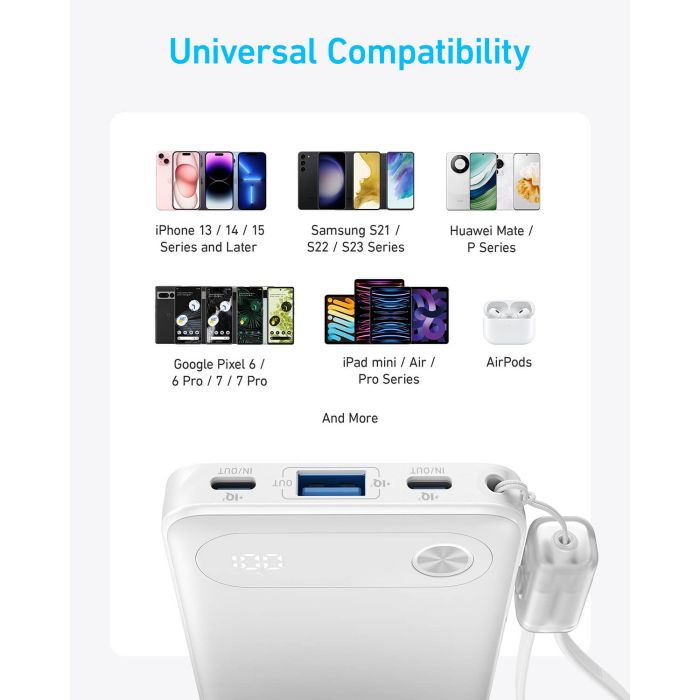 Anker powerbank 22,5W A1257G11 je zasnovan tako, da vam ponuja priročno polnjenje kjerkoli in kadarkoli. Z vgrajenim USB-C kablom vam ni treba skrbeti za dodatne kable, saj je vse, kar potrebujete, že vključeno. Ta powerbank je združljiv s široko paleto naprav, vključno z iPhone serijo 13/14/15 in Samsung Galaxy S23, kar zagotavlja univerzalno uporabnost. Njegova kompaktna velikost omogoča enostavno prenašanje, ne glede na to, ali ste na poti ali doma. Z Anker powerbank 22,5W A1257G11 boste vedno pripravljeni na polnjenje vaših naprav.