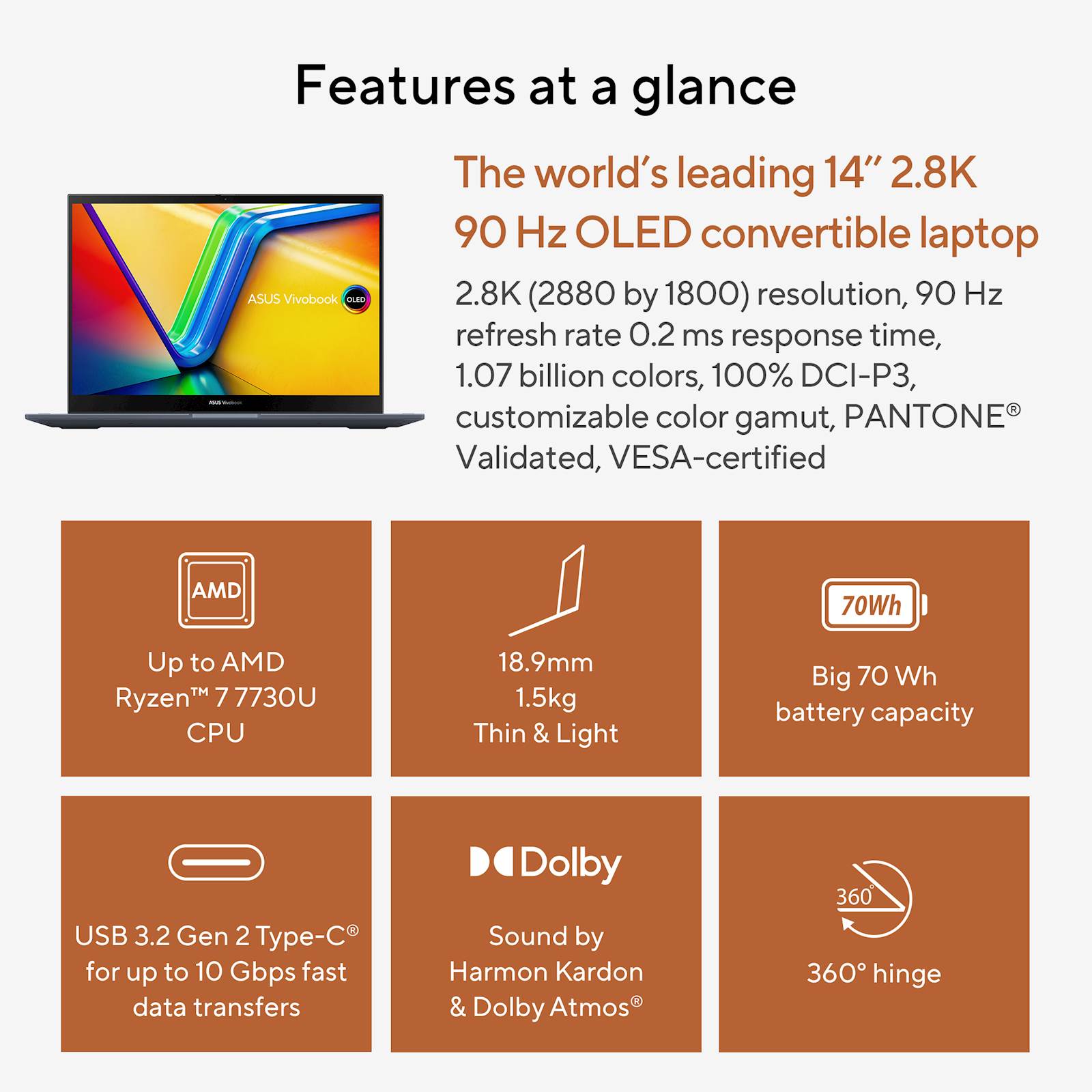 Vivobook S 14 Flip OLED se ponaša z osupljivim 2.8K OLED zaslonom, ki ponuja izjemno jasnost in živahne barve. Zaslon je potrjen s strani PANETONE in pokriva 100% barvnega prostora DCI-P3, kar zagotavlja natančne in realistične barve. Zaslon je tudi na dotik, kar omogoča interaktivno in intuitivno uporabo. Ne glede na to, ali gledate filme, urejate fotografije ali ustvarjate umetniška dela, bo ta zaslon poskrbel za izjemno vizualno izkušnjo.