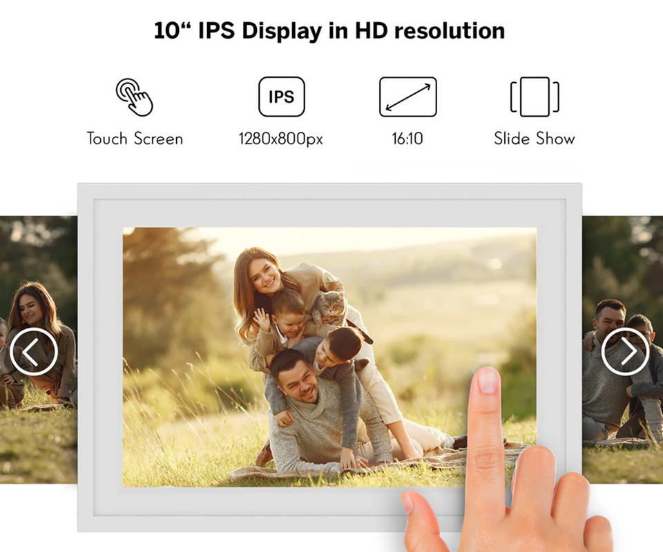 THOMSON pametni digitalni foto okvir F10 je zasnovan za vse, ki želijo svoje spomine ohraniti žive na sodoben način. S 10,1-palčnim IPS HD zaslonom na dotik omogoča jasno in barvito prikazovanje fotografij in videov. Wi-Fi povezljivost omogoča brezžično pošiljanje vsebin preko mobilne aplikacije, kar olajša deljenje spominov z družino in prijatelji. Okvir je primeren za postavitev na mizo ali montažo na steno, kar omogoča prilagodljivost v vsakem prostoru. Z dodatnimi funkcijami, kot so ura, koledar in prikaz vremena, je ta okvir več kot le naprava za prikaz fotografij.
