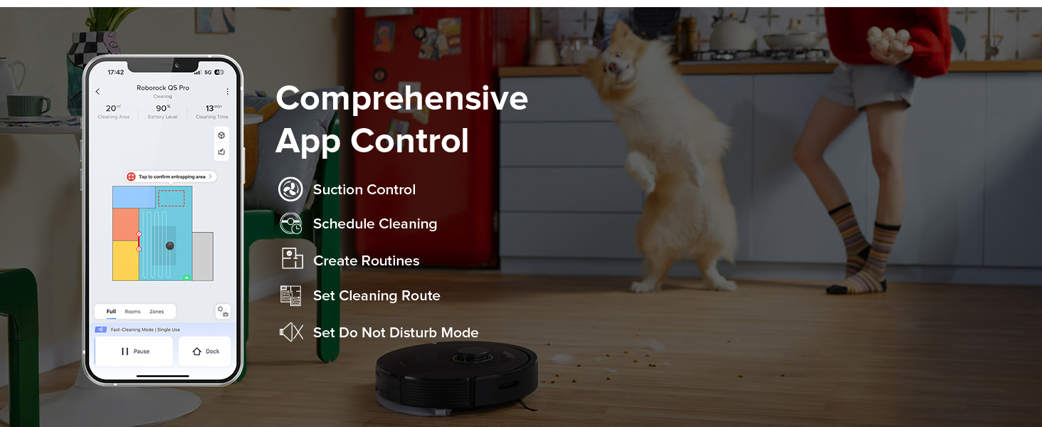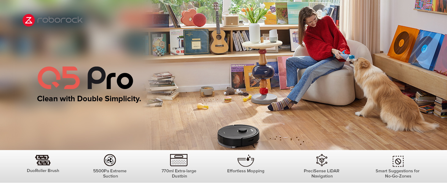 DuoRoller krtača in 5500 Pa močnejše sesanje: z uporabo Roborockove najnovejše tehnologije DuoRoller Brush in zahvaljujoč izjemni sesalni moči 5500 Pa Q5 Pro učinkovito odstrani umazanijo z različnih vrst tal in doseže globlje čiščenje na preprogah, izboljša stopnjo pobiranja dlačic in hkrati zagotovi manj zapletanja. Je idealna izbira za družine hišnih ljubljenčkov.