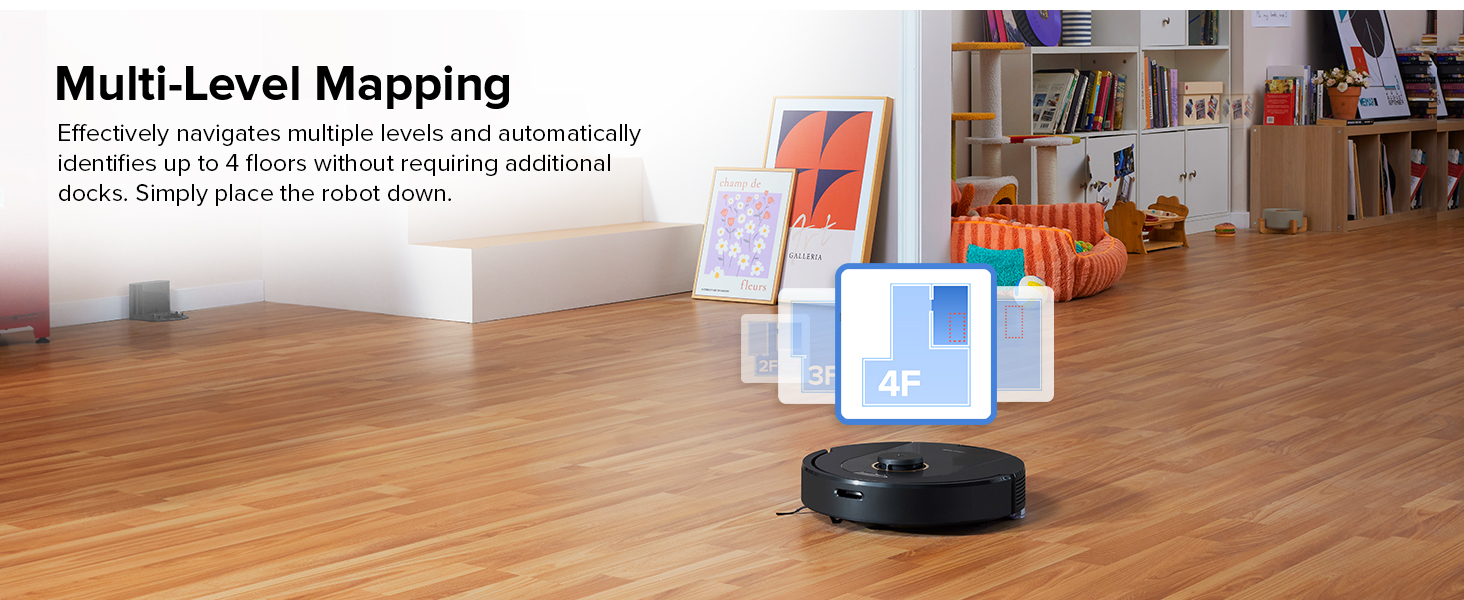 Čistite pametneje z navigacijo PreciSense LiDAR: navigacija PreciSense LiDAR s 3D mapiranjem poskrbi za natančno čiščenje. Navigacijski sistem PreciSense LiDAR so možgani Q5 Pro. Ponaša se s funkcijo hitrega mapiranja, ki lahko skenira in ustvari podrobne zemljevide v nekaj sekundah ter poišče optimalno pot za čiščenje vašega doma. 3D Mapping podpira ogled vašega doma v 3D in dodajanje pohištva, potrebščin za hišne ljubljenčke in talnih materialov za virtualno prenovo vašega doma.