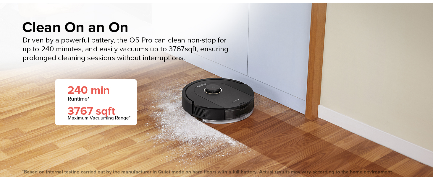Dolgo neprekinjeno čiščenje Q5 Pro, ki ga poganja zmogljiva baterija, lahko čisti do 240 minut in enostavno sesa do 350 kvadratnih metrov, kar zagotavlja dolgotrajne čistilne seje brez prekinitev.