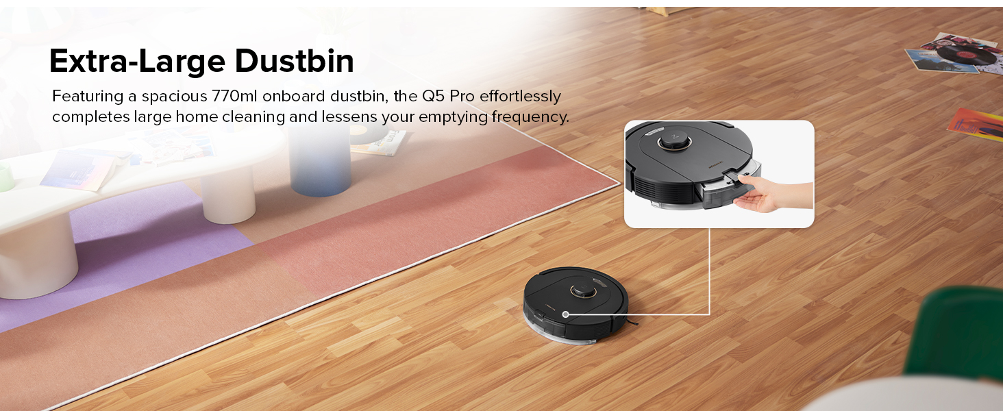 Izjemno velika posodica za prah Q5 Pro ima prostorno 770 ml posodico za prah ter brez napora dopolnjuje veliko čiščenje doma in zmanjšuje vašo frekvenco praznjenja.