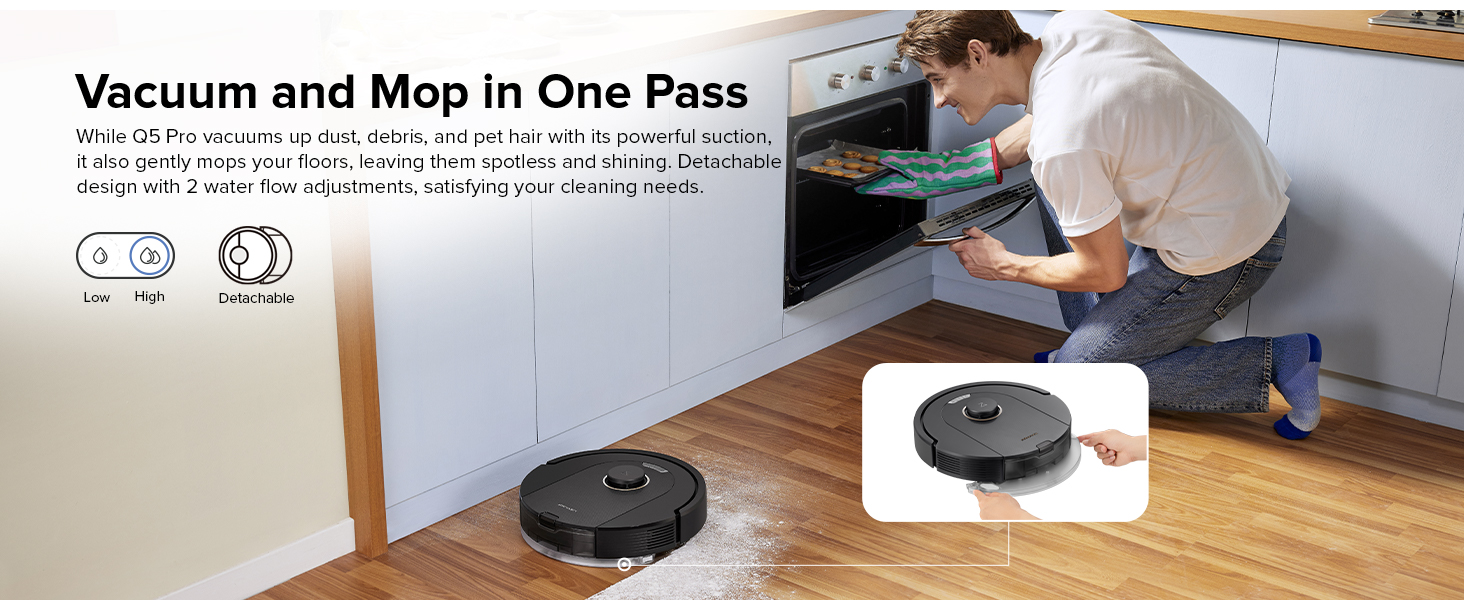 Istočasno sesanje in brisanje: nudi učinkovito čiščenje. S 180ml sistemom SnapMop lahko Q5 Pro hkrati sesa in briše, da odstrani drobno umazanijo, ki jo samo sesanje lahko izpusti. Podpira 2 nastavitvi pretoka vode, snemljiva zasnova krpe pa je dovolj prilagodljiva, da zadovolji vse vaše potrebe po čiščenju.