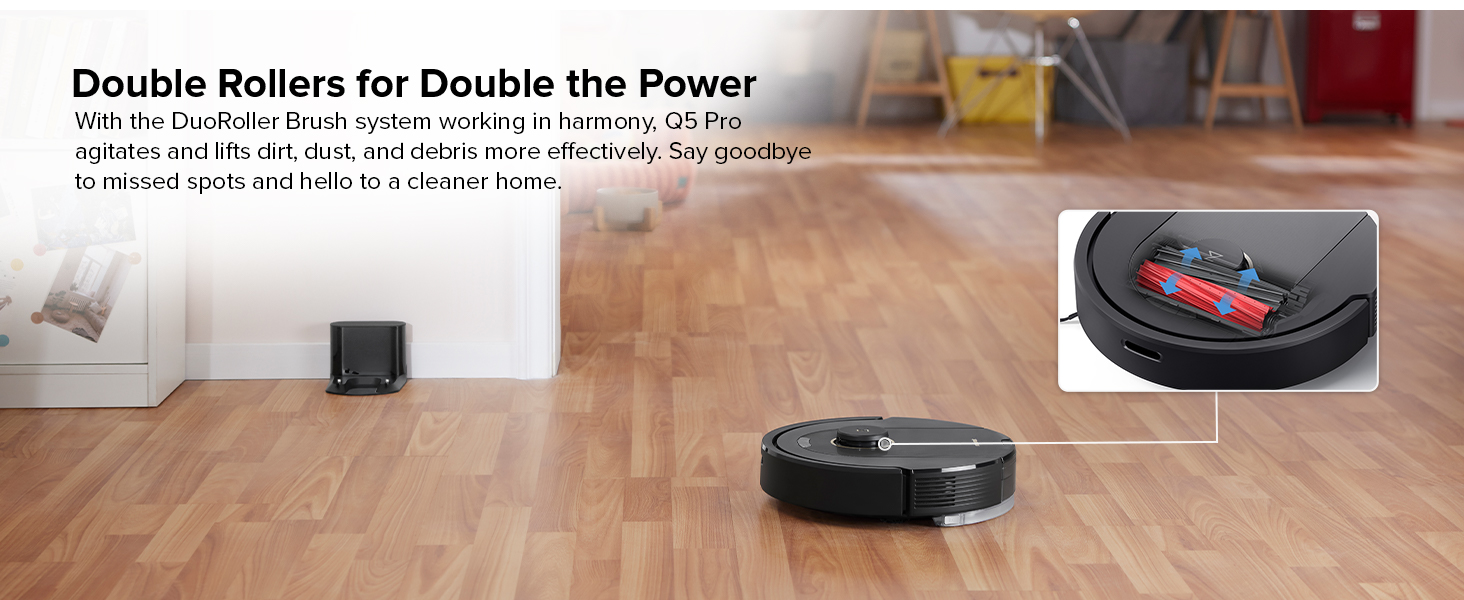 Dvojni DuoRoller krtači za dvojno moč Dvojni krtači DuoRoller delujejo v harmoniji, Q5 Pro s tem učinkoviteje dvigne umazanijo, prah in naplavine. Poslovite se od zamujenih mest in pozdravite čistejši dom.