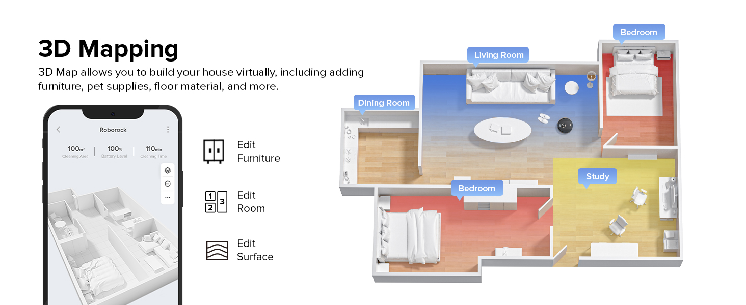 3D mapiranje 3D zemljevid vam omogoča, da svojo hišo praktično zgradite, vključno z dodajanjem pohištva, zalog za hišne ljubljenčke, talnim materialom in še več. Hitro mapiranje Ustvari zemljevid do 6 -krat hitreje* pred prvo nalogo za hitro in učinkovito čiščenje.