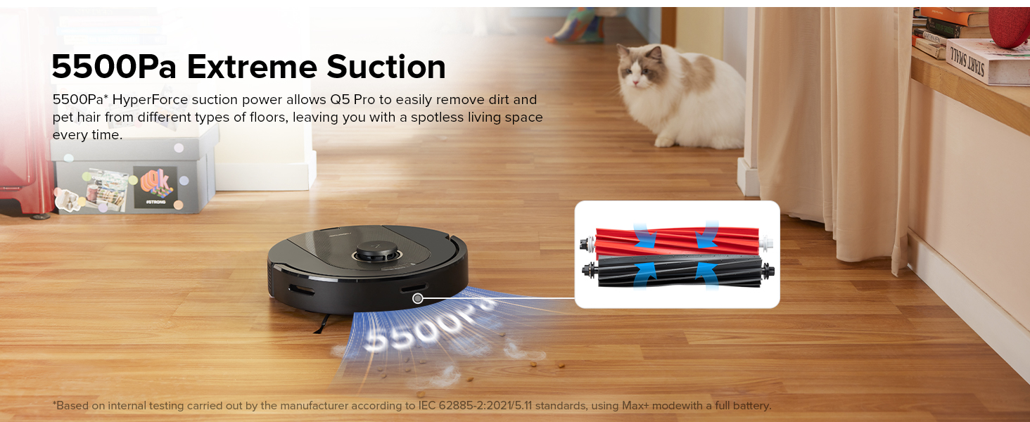 5500 Pa ekstremno sesanje 5500 Pa HyperForce sesalna moč omogoča, da Q5 Pro enostavno odstrani umazanijo in dlake hišnih ljubljenčkov z različnih vrst tal, tako da imate vsakič brezmadežen življenjski prostor. *Na podlagi internega testiranja, ki ga je izvedel proizvajalec v skladu s standardi IEC 62885-2:2021/5.11, z uporabo načina Max+ s polno baterijo.