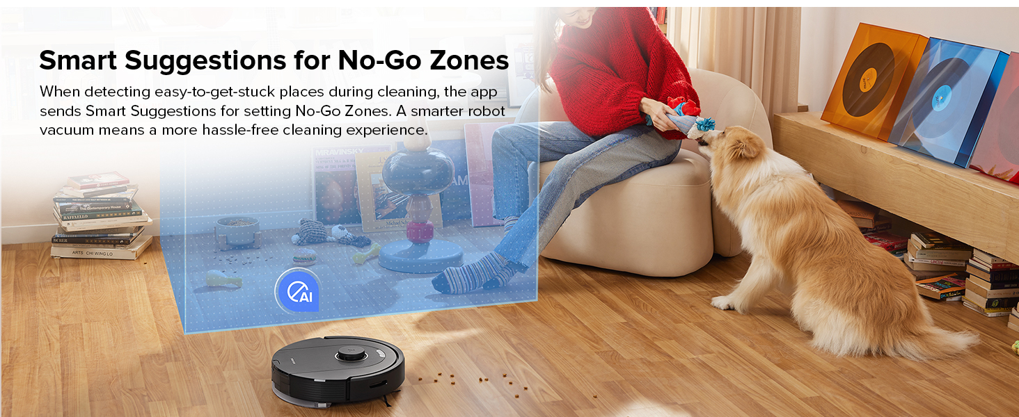 Pametni predlogi za prepovedana območja Pri zaznavanju mest, ki jih je enostavno zasukati med čiščenjem, aplikacija pošlje pametne predloge za nastavitev prepovedanih območij. Pametnejši robotski sesalnik pomeni več čiščenja brez težav.