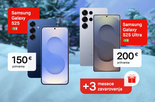 Izberi enega izmed znižanih telefonov Galaxy S25 ali Galaxy S25 Ultra in pridobi še 3 mesece brezplačnega zavarovanja svoje nove mobilne naprave. Promocijo lahko izkoristiš do 31. decembra.