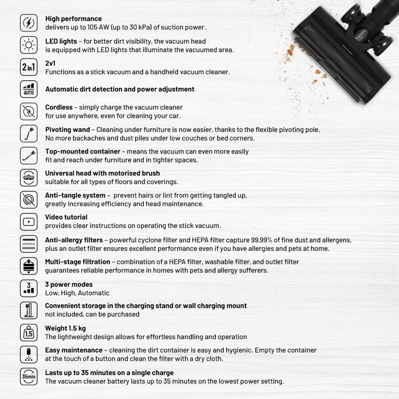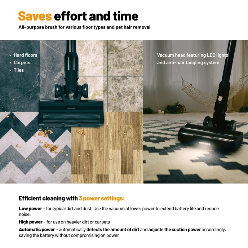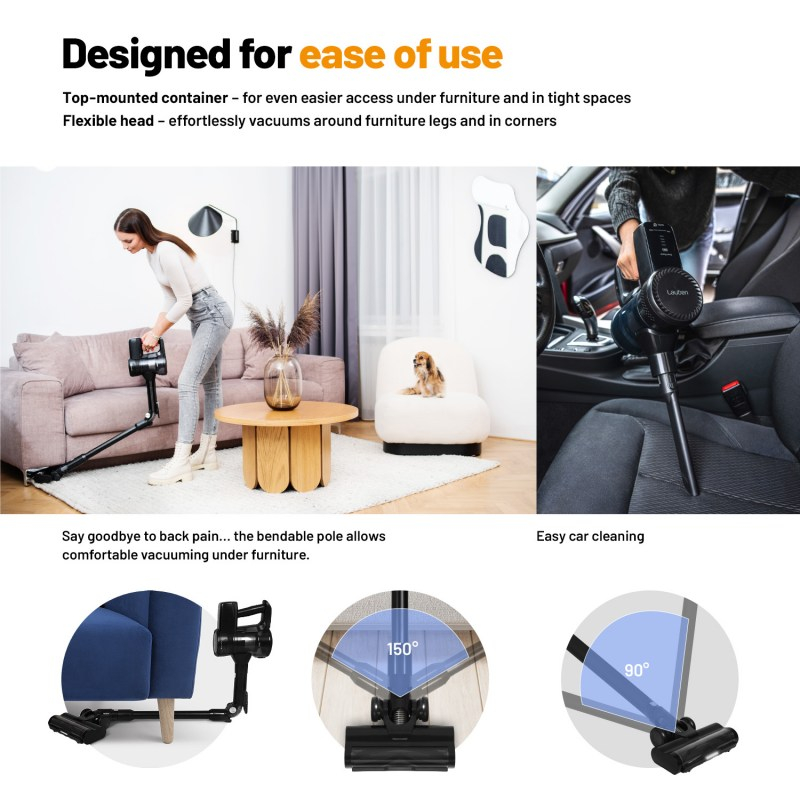 Pokončni sesalnik Lauben je zasnovan za hitro in učinkovito čiščenje vseh vrst površin. Z visoko sesalno močjo, ki doseže do 105 AW, se samodejno prilagaja stopnji umazanije, kar omogoča optimalno čiščenje brez dodatnih nastavitev. LED osvetlitev na sesalni glavi zagotavlja boljšo vidljivost nečistoč, tako da vam ne uide niti najmanjši delček prahu. Zaradi brezžične zasnove je uporaba sesalnika mogoča kjerkoli, tudi v avtomobilu. S fleksibilno palico z zgibom je čiščenje pod pohištvom in v ozkih prostorih enostavno, posodo za umazanijo pa izpraznite povsem higienično.