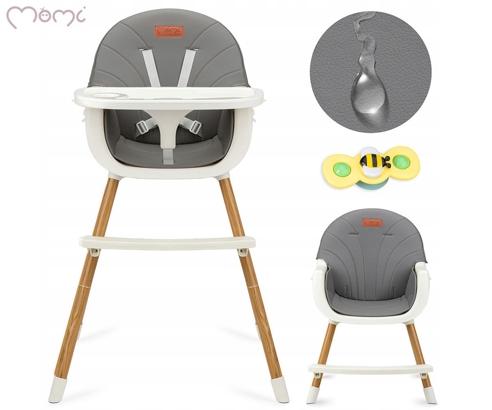 MoMi REKI je večnamenski otroški stolček, zasnovan za udobje in varnost vašega malčka. Njegova ergonomska oblika zagotavlja pravilno držo med hranjenjem, medtem ko 5-točkovni varnostni pasovi poskrbijo za stabilnost. Stolček je primeren za otroke od 6 mesecev dalje in se prilagaja njihovemu razvoju. Z nastavljivim dvojnim pladnjem, ki ga je mogoče enostavno odstraniti in pomiti v pomivalnem stroju, je vzdrževanje čistoče preprosto. Stolček je izdelan iz kakovostnih materialov, kot je eko usnje, ki omogoča enostavno čiščenje, kar je idealno za vsakodnevno uporabo.