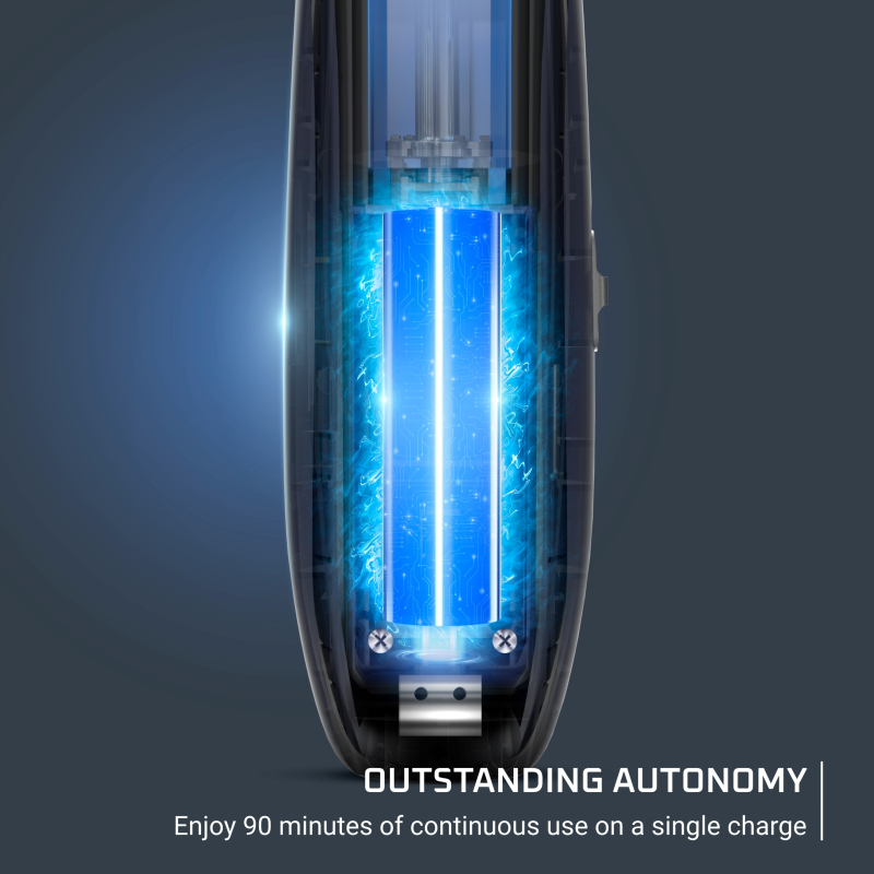 Rowenta prirezovalnik TN1851E0 Barber Experience je zasnovan za dolgotrajno uporabo, saj ponuja 90 minut neprekinjenega delovanja z enim polnjenjem. To omogoča več sej prirezovanja brez potrebe po pogostem polnjenju, kar je idealno za tiste, ki želijo hitro in učinkovito nego las in brade. Poleg tega, elegantna polnilna baza omogoča hitro polnjenje in elegantno shranjevanje, kar zagotavlja, da je prirezovalnik vedno pripravljen za uporabo. Zanesljiv motor profesionalnega razreda zagotavlja visoko učinkovitost rezanja, kar pomeni, da boste vedno dosegli popolne rezultate.