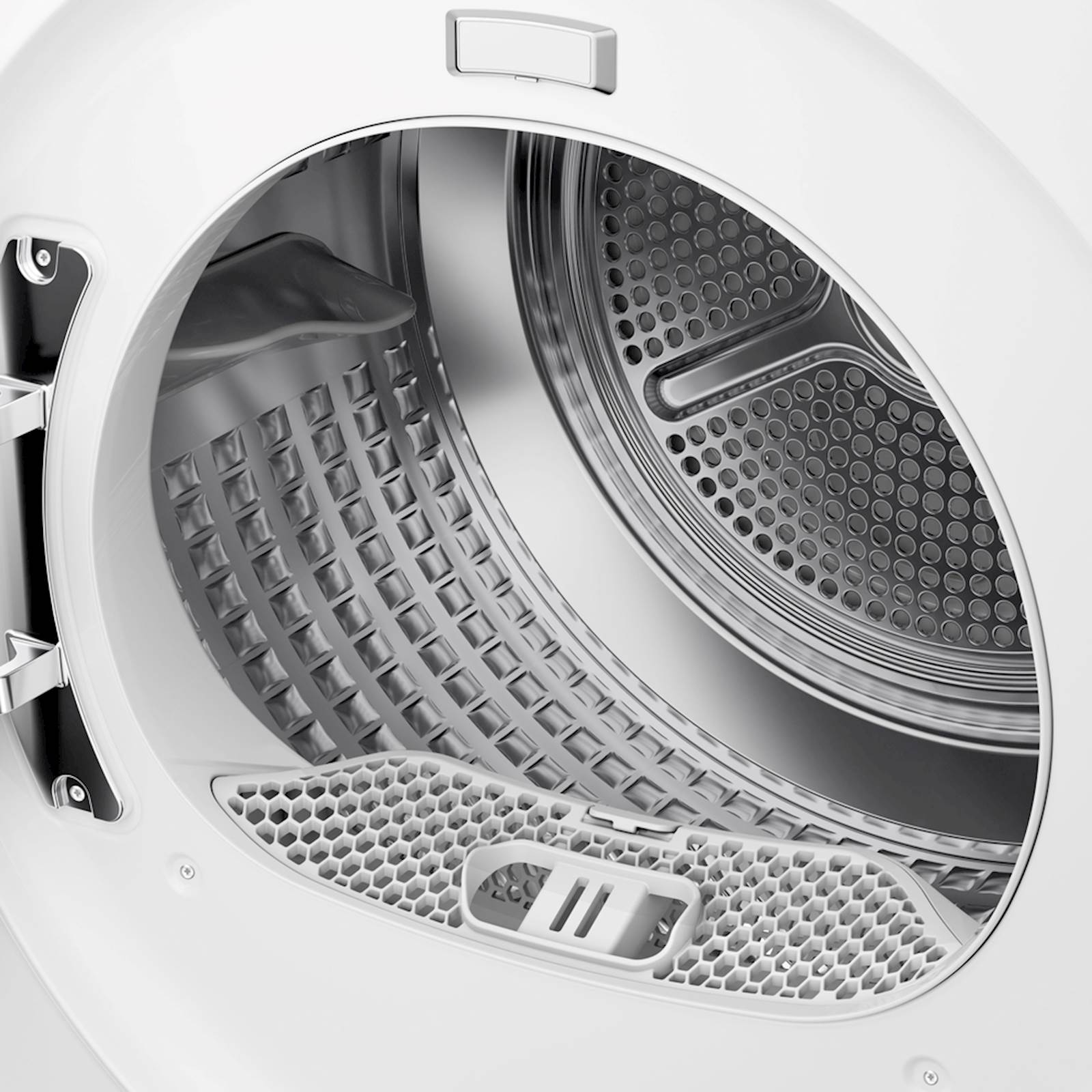 Nežno sušenje je ključno za ohranjanje kakovosti vaših oblačil, še posebej pri občutljivih tkaninah. Ta sušilni stroj je opremljen s programom Warm Dry, ki suši pri nizki temperaturi 38 °C. To ne samo da ščiti tkanine, ampak tudi zmanjša porabo energije do 25 %. Tako lahko brez skrbi sušite volnene in občutljive tkanine, saj prilagojeno vrtenje bobna in nadzor temperature zagotavljata, da oblačila ohranijo svojo naravno mehkobo.