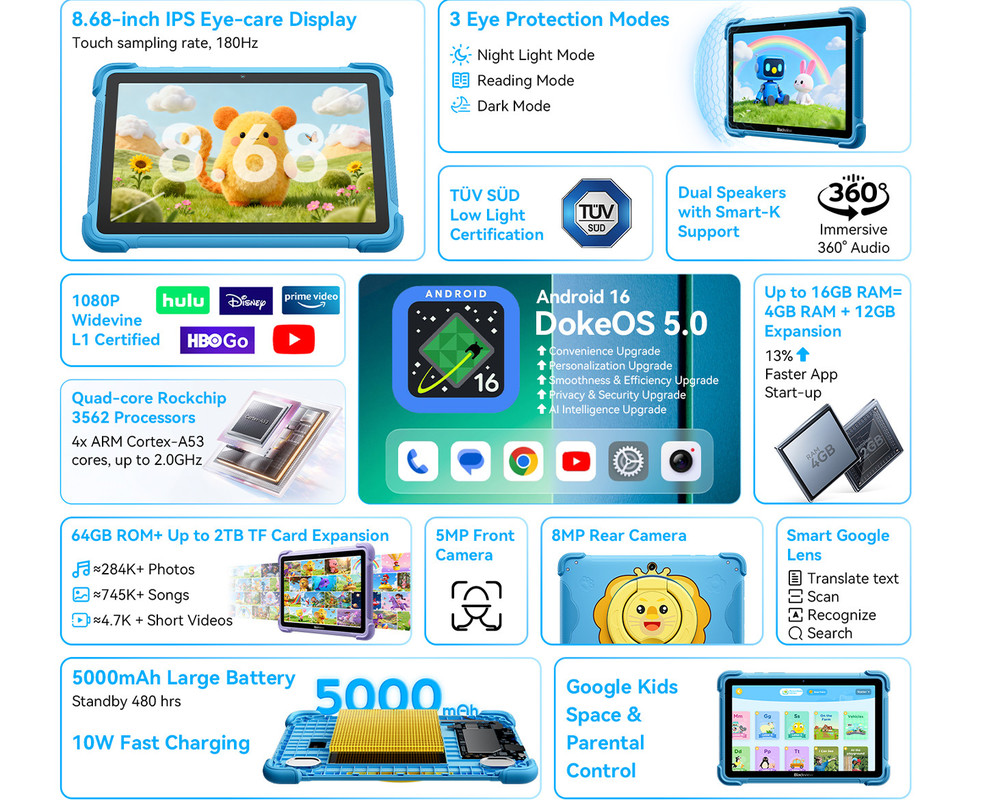 Blackview LINK 1 KIDS je popoln spremljevalec za vaše otroke, ki združuje zabavo in učenje v enem. Z operacijskim sistemom Android in prilagojenim Google Kids Space, omogoča varno in zdravo digitalno okolje. Otroci lahko uživajo v igrah, aplikacijah in knjigah, ki so prilagojene njihovim interesom. Tablica je opremljena z 8,68-palčnim HD IPS zaslonom, ki zagotavlja jasne in živahne prikaze. Tanek in lahek dizajn omogoča enostavno prenašanje, medtem ko zaščitni etui s stojalom omogoča udobno uporabo brez uporabe rok.