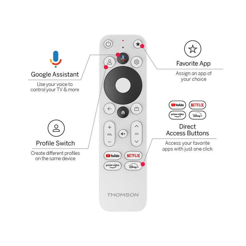 Multimedijski predvajalnik Thomson STREAMING BOX PLUS 270 ponuja ne le vrhunsko vizualno, temveč tudi avdio izkušnjo. Zahvaljujoč Dolby Atmos tehnologiji, se boste počutili, kot da ste sredi dogajanja, saj ustvarja dinamičen zvok, ki vas popolnoma potopi v vsebino. Naprava je opremljena z naprednimi mikrofoni, ki omogočajo prostoročno upravljanje televizorja z glasom, kar je idealno za integracijo s pametnim domom. S funkcijo "Najdi moj daljinski upravljalnik" nikoli več ne boste izgubili daljinca, saj ga lahko enostavno poiščete s pritiskom na gumb na glavni napravi.