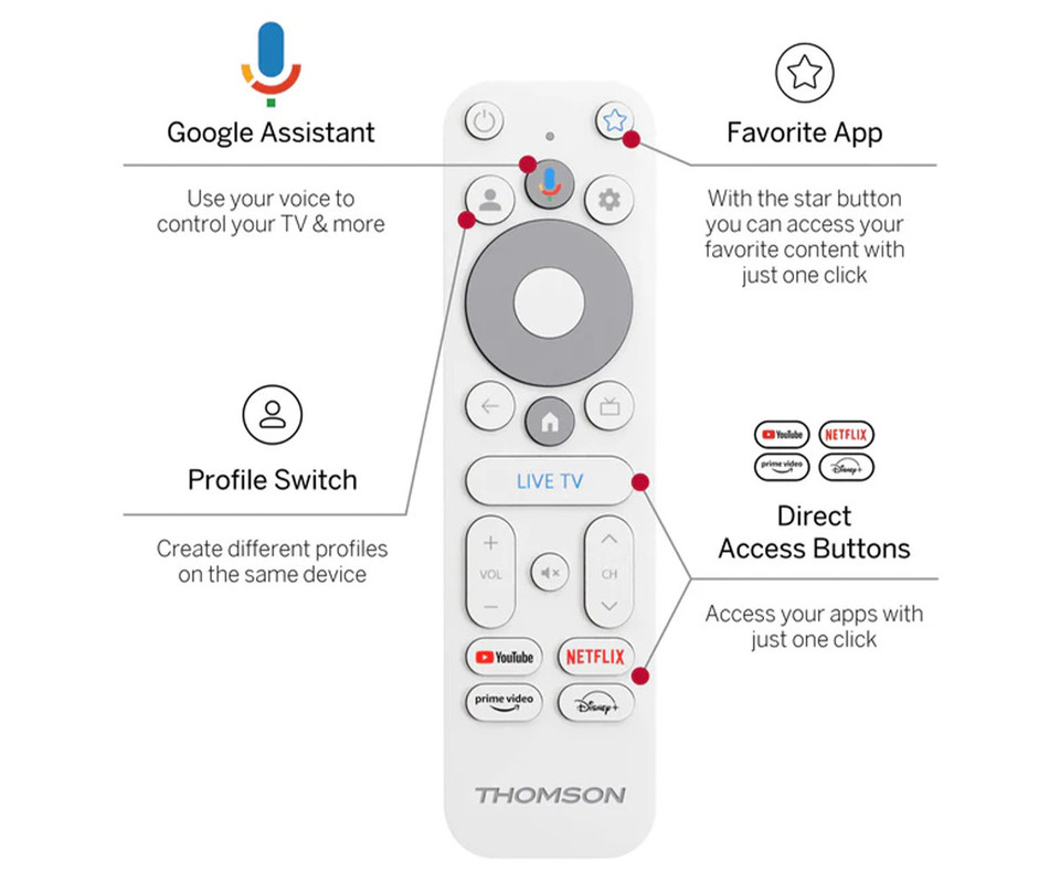Thomson GO CAST 152 je idealna rešitev za vse, ki želijo svojo televizijo nadgraditi v pametni medijski center. S podporo za Google TV omogoča enostaven dostop do priljubljenih aplikacij, kot so Netflix, Disney+, Prime Video in YouTube. Zahvaljujoč vgrajenemu Chromecastu lahko vsebino z vašega pametnega telefona zrcalite neposredno na zaslon televizorja. Pametni daljinski upravljalnik z glasovno podporo Google Assistant poskrbi za udobno in hitro upravljanje. Kompaktna zasnova in preprosta namestitev omogočata, da ga vzamete s seboj kamorkoli, bodisi doma ali na poti.