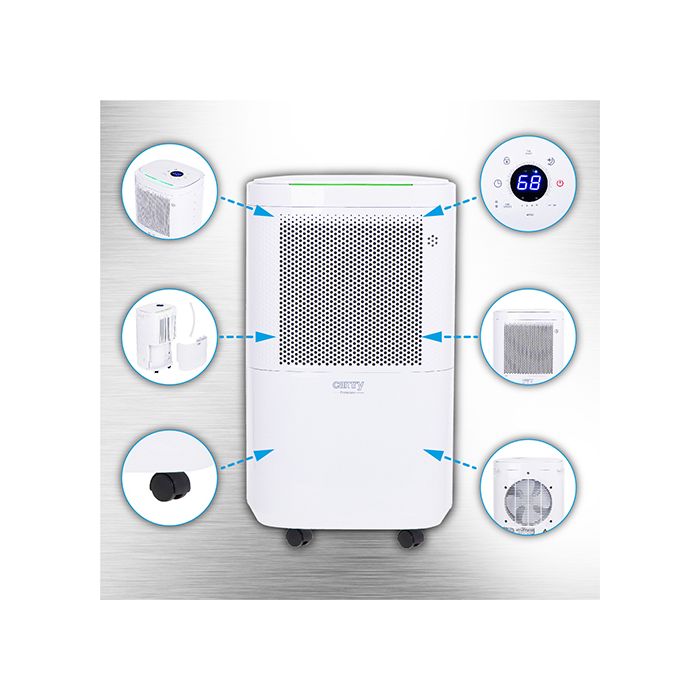 Razvlaževalec zraka Camry CR7851 je opremljen z indikatorjem vlažnosti, ki s tremi barvami prikazuje stopnjo vlažnosti na sprednji strani naprave. Modra barva označuje nizko vlažnost, zelena srednjo, rdeča pa visoko vlažnost. Funkcija odmrzovanja in čiščenja zraka preko PP filtra ter filtra z aktivnim ogljem zagotavlja svež in čist zrak v prostoru. Dodatna funkcija kroženja zraka ter otroška ključavnica poskrbita za varno in učinkovito delovanje naprave.