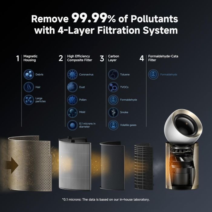 Ta čistilec zraka je opremljen s štiristopenjskim sistemom filtracije, ki zajame delce že od velikosti 0,1 μm. To vključuje HEPA H13 filtracijo, ki odstrani 99,99 % prahu, cvetnega prahu, dima, dlak hišnih ljubljenčkov in drugih nečistoč. Poleg tega aktivno oglje in formaldehid-katalizator zagotavljata dodatno zaščito pred škodljivimi snovmi, kar pripomore k bolj zdravemu notranjemu okolju. Ta večstopenjski sistem filtracije je zasnovan za maksimalno učinkovitost in dolgotrajno uporabo.