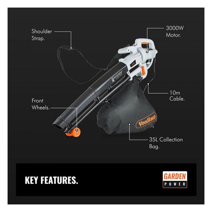 VonHaus električni puhalnik sesalnik listja je nepogrešljiv pripomoček za vsak vrt. Z močjo 3000W zlahka odstrani listje in druge ostanke, kar vam omogoča, da vaš vrt ostane urejen in čist. Naprava deluje v treh funkcijah: puhalnik, sesalnik in mulčer, kar pomeni, da lahko listje najprej zberete na kup, nato ga posesate v prostorno 35-litrsko vrečo, na koncu pa ga mulčate v material, primeren za kompostiranje. Zahvaljujoč dolgemu 10-metrskemu kablu in priročni naramnici je uporaba enostavna in udobna, tudi pri daljšem delu.