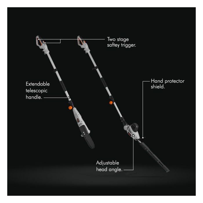Opremljeni s škarjami in žago boste lahko brez napora obrezovali žive meje, veje in gosto zaraščeno grmičevje. Trimer za živo mejo ima prednost v hitrosti brez obremenitve 1500 vrt/min, impresivnih 460W zmogljivosti in nastavljivi rezalni glavi. Z lahkoto se spoprijemo z visokimi in težko dostopnimi vejami. Prilagodite dolžino palice in nagnite glavo tako, da bo ustrezala liniji vašega reza. Motorna žaga ponuja 750W zmogljivosti z 8” (20cm) Oregon verigo, palico ter hitrostjo verige 11 m/s. Za udobje in varnost je na orodju nameščen podporni pas.