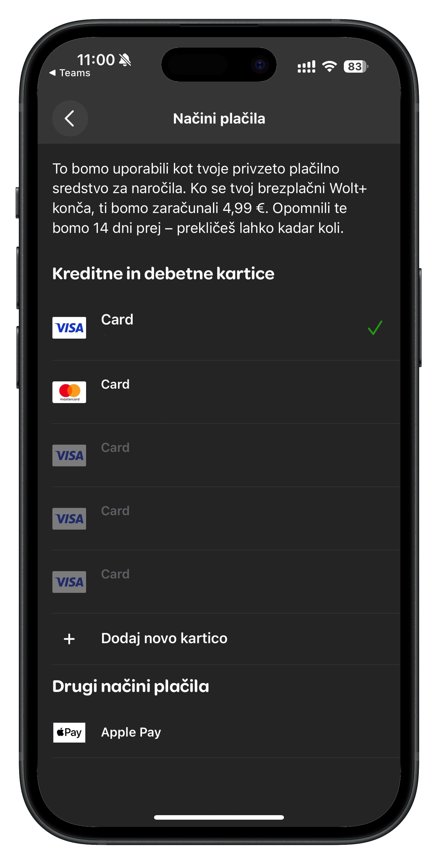 Izberi privzeto plačilno sredstvo za naročanje znotraj aplikacije.
