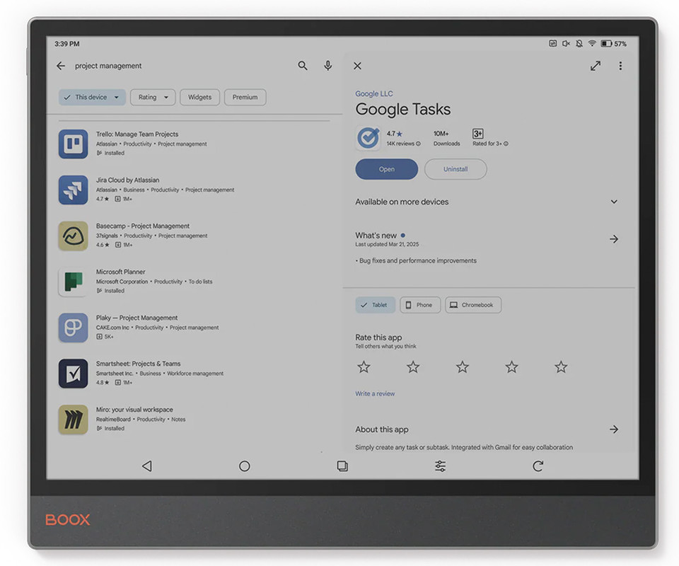 BOOX tablični računalnik TAB X C 4751 ponuja izjemno uporabniško izkušnjo z intuitivnim branjem in občutkom pisanja kot na pravem papirju. Zaslon je popolnoma laminiran, kar približa besedilo vašim očem in daje občutek, kot da gledate pravi papir. Poleg tega naprava omogoča prilagodljivo osvetlitev, ki se prilagaja svetlobnim pogojem, kar je idealno za uporabo podnevi ali ponoči. S funkcijo razdeljenega zaslona lahko uporabljate dve aplikaciji hkrati, kar povečuje vašo produktivnost.